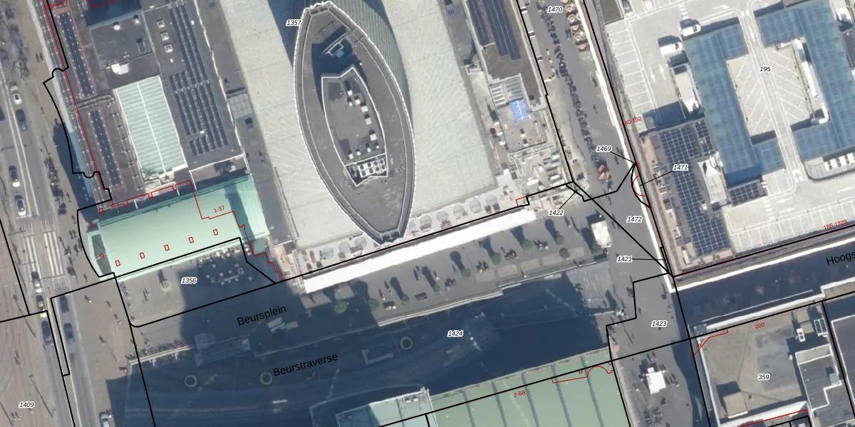 Het perceel waarop Beursplein 15 staat heeft een oppervlakte van 1,3 ha. Dit is een zeer groot perceel. De perceeloppervlakte wordt geregistreerd door het Kadaster. Gedetailleerde informatie over de maten van dit perceel kunt u vinden in het rapport Kadastrale kaart met maatvoering van Beursplein 15.