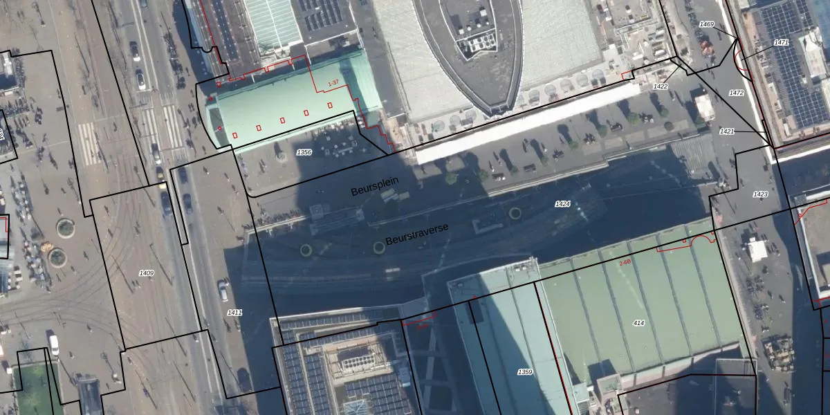 Beurstraverse 37 is gelegen op kadastraal perceel RTD04AF1424. Deze kadastrale aanduiding is uniek en wordt gebruikt door het Kadaster om eigendomsrechten en andere zakelijke rechten vast te leggen. Het perceel maakt onderdeel uit van de kadastrale gemeente Rotterdam.