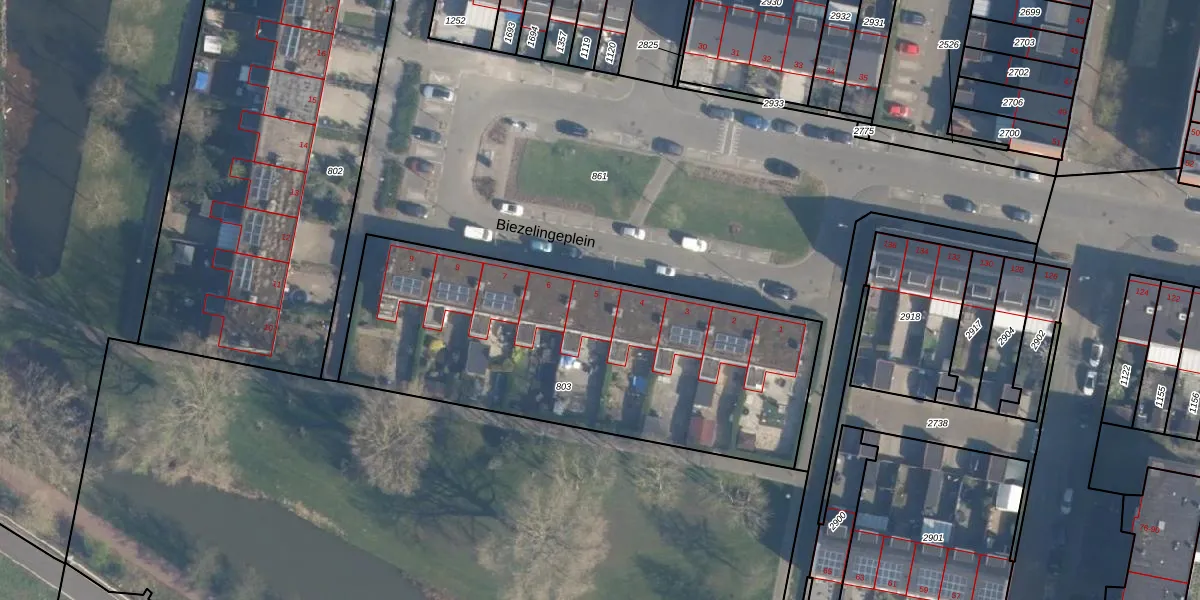 Het perceel waarop Biezelingeplein 5 staat heeft een oppervlakte van 1925 m². Dit is een zeer groot perceel. De perceeloppervlakte wordt geregistreerd door het Kadaster. Gedetailleerde informatie over de maten van dit perceel kunt u vinden in het rapport Kadastrale kaart met maatvoering van Biezelingeplein 5.