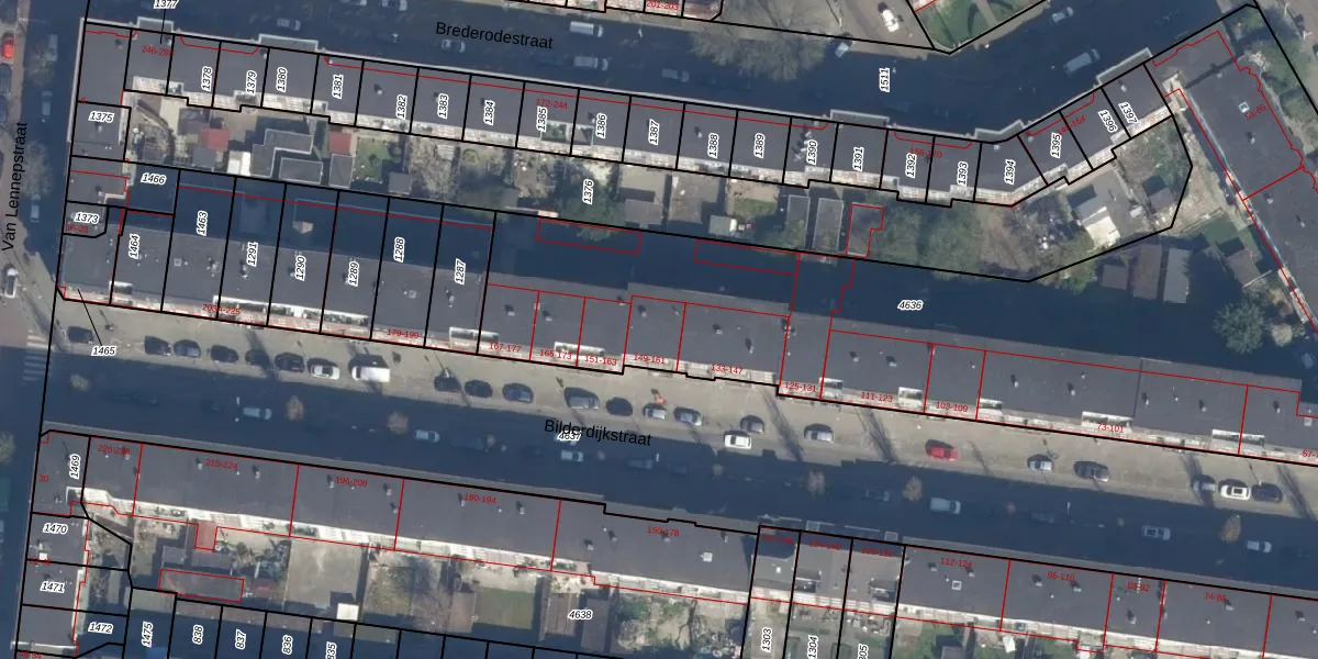 Het perceel waarop Bilderdijkstraat 153 staat heeft een oppervlakte van 4355 m². Dit is een zeer groot perceel. De perceeloppervlakte wordt geregistreerd door het Kadaster. Gedetailleerde informatie over de maten van dit perceel kunt u vinden in het rapport Kadastrale kaart met maatvoering van Bilderdijkstraat 153.