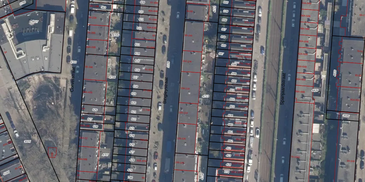 Bingleystraat 114 is gelegen op kadastraal perceel DHV00H4713. Deze kadastrale aanduiding is uniek en wordt gebruikt door het Kadaster om eigendomsrechten en andere zakelijke rechten vast te leggen. Het perceel maakt onderdeel uit van de kadastrale gemeente Delfshaven.