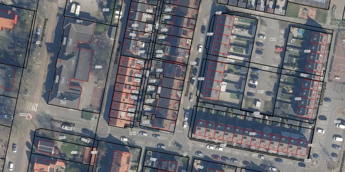 Gebruik de zoekbalk of klik op een perceel voor informatie over de adressen binnen dit perceel.