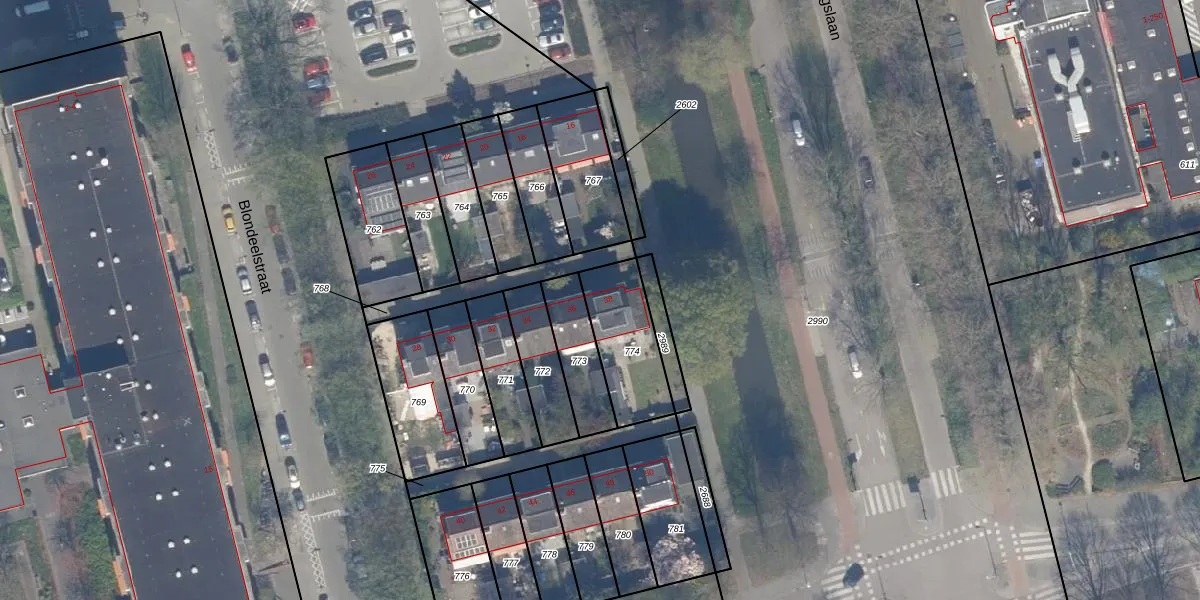 Blondeelstraat 38 is gelegen op kadastraal perceel KLG00K774. Deze kadastrale aanduiding is uniek en wordt gebruikt door het Kadaster om eigendomsrechten en andere zakelijke rechten vast te leggen. Het perceel maakt onderdeel uit van de kadastrale gemeente Kralingen.