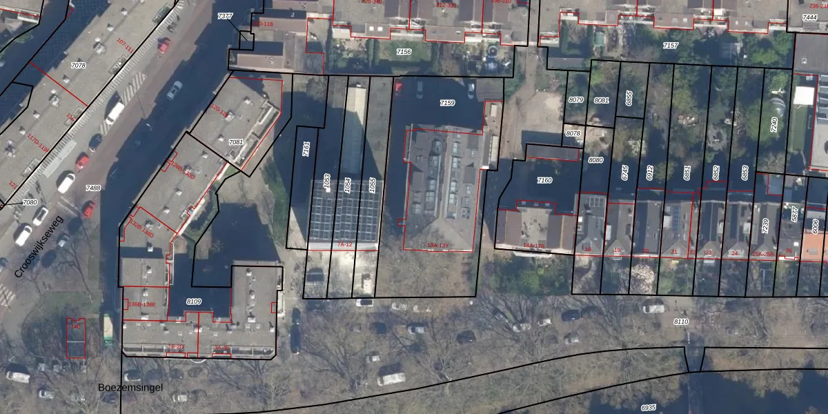 Het perceel waarop het adres ligt is RTD07-R-7159. De afkorting 'RTD07' staat voor kadastrale gemeente Rotterdam. De gemiddelde perceeloppervlakte in de kadastrale gemeente Rotterdam is 506,86 m². Dit perceel is met zijn 1355 m² dus groter dan gemiddeld. Het kleinste perceel in de kadastrale gemeente is 0 m² groot. De grootste perceeloppervlakte is 10,8 ha. Op het perceel liggen in totaal 35 adressen. De laatste wijziging in het de Basisregistratie Kadaster (BRK) was op 24-01-2003.