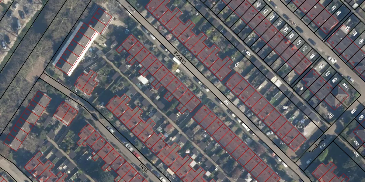 Het perceel waarop Boogjes 46 staat heeft een oppervlakte van 9846 m². Dit is een zeer groot perceel. De perceeloppervlakte wordt geregistreerd door het Kadaster. Gedetailleerde informatie over de maten van dit perceel kunt u vinden in het rapport Kadastrale kaart met maatvoering van Boogjes 46.