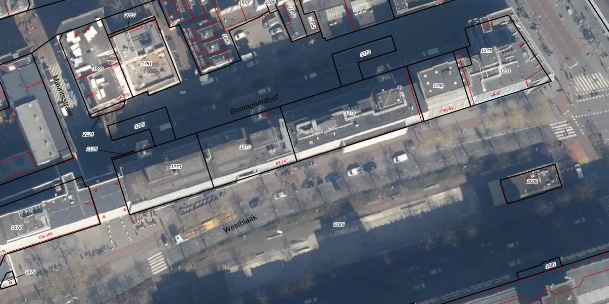 Het perceel waarop het adres ligt is RTD04-AG-1272. De afkorting 'RTD04' staat voor kadastrale gemeente Rotterdam. Het perceel is 828 m² groot. Dat is kleiner dan de gemiddelde perceeloppervlakte in Rotterdam, dat op 1239,97 m² ligt. Het kleinste perceel in de kadastrale gemeente is 0 m² groot. De grootste perceeloppervlakte is 17,3 ha. Op het perceel liggen in totaal 13 adressen. De huidige grenzen van het perceel zijn digitaal in de Basisregistratie Kadaster (BRK) geregistreerd op 13-12-2006.