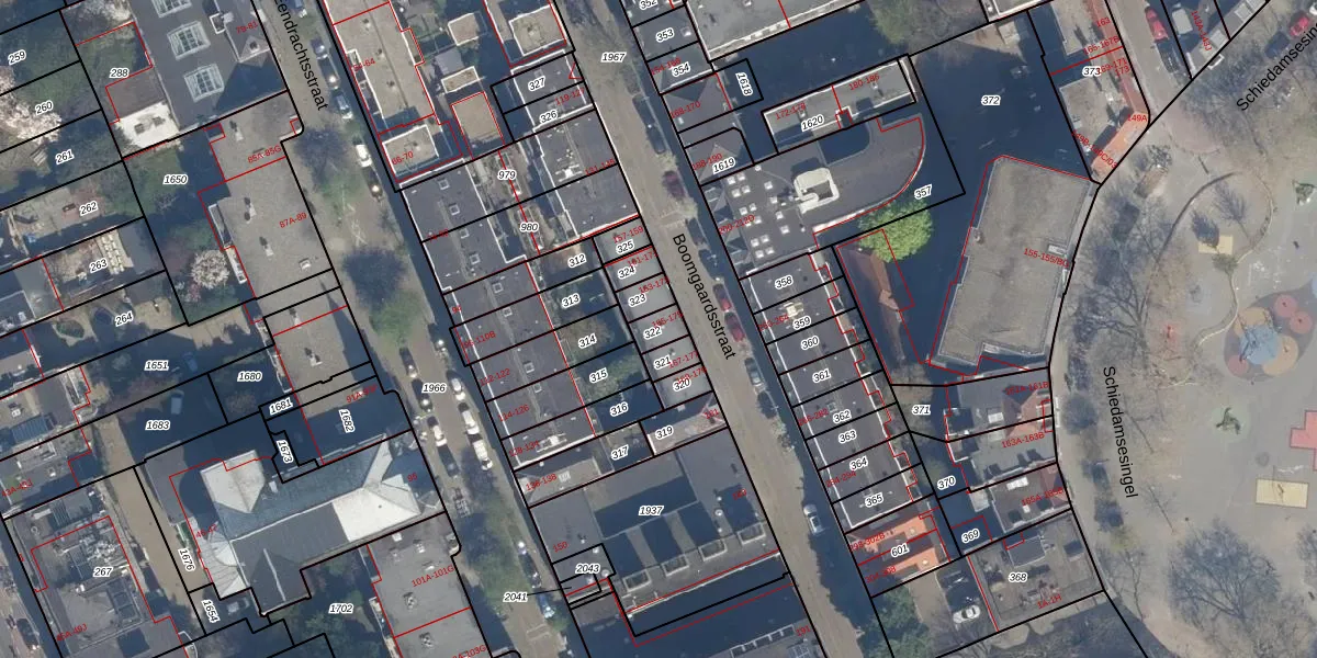 Boomgaardsstraat 165 is gelegen op kadastraal perceel RTD04AG322. Deze kadastrale aanduiding is uniek en wordt gebruikt door het Kadaster om eigendomsrechten en andere zakelijke rechten vast te leggen. Het perceel maakt onderdeel uit van de kadastrale gemeente Rotterdam.