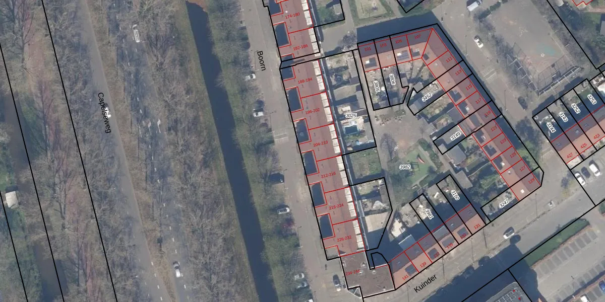 Het perceel waarop Boorn 208 staat heeft een oppervlakte van 1645 m². Dit is een zeer groot perceel. De perceeloppervlakte wordt geregistreerd door het Kadaster. Gedetailleerde informatie over de maten van dit perceel kunt u vinden in het rapport Kadastrale kaart met maatvoering van Boorn 208.