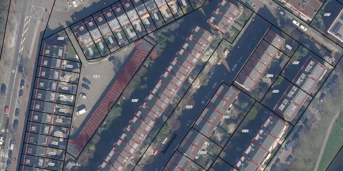 Het perceel waarop Boreelstraat 19-A staat heeft een oppervlakte van 4899 m². Dit is een zeer groot perceel. De perceeloppervlakte wordt geregistreerd door het Kadaster. Gedetailleerde informatie over de maten van dit perceel kunt u vinden in het rapport Kadastrale kaart met maatvoering van Boreelstraat 19-A.