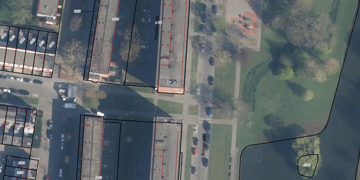 Het perceel waarop Bornerveld 106 staat heeft een oppervlakte van 2903 m². Dit is een zeer groot perceel. De perceeloppervlakte wordt geregistreerd door het Kadaster. Gedetailleerde informatie over de maten van dit perceel kunt u vinden in het rapport Kadastrale kaart met maatvoering van Bornerveld 106.