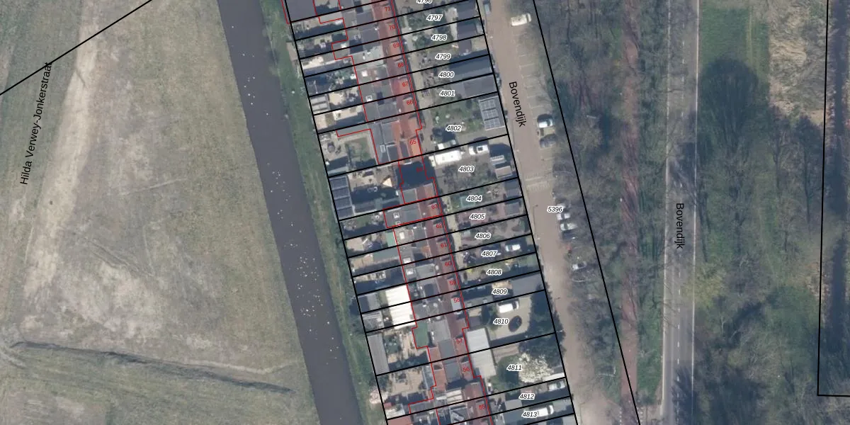Het perceel waarop Bovendijk 63 staat heeft een oppervlakte van 194 m². Dit is een middelgroot perceel. De perceeloppervlakte wordt geregistreerd door het Kadaster. Gedetailleerde informatie over de maten van dit perceel kunt u vinden in het rapport Kadastrale kaart met maatvoering van Bovendijk 63.