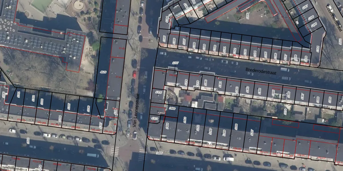 Het perceel waarop Brederodestraat 260 staat heeft een oppervlakte van 58 m². Dit is een klein perceel. De perceeloppervlakte wordt geregistreerd door het Kadaster. Gedetailleerde informatie over de maten van dit perceel kunt u vinden in het rapport Kadastrale kaart met maatvoering van Brederodestraat 260.