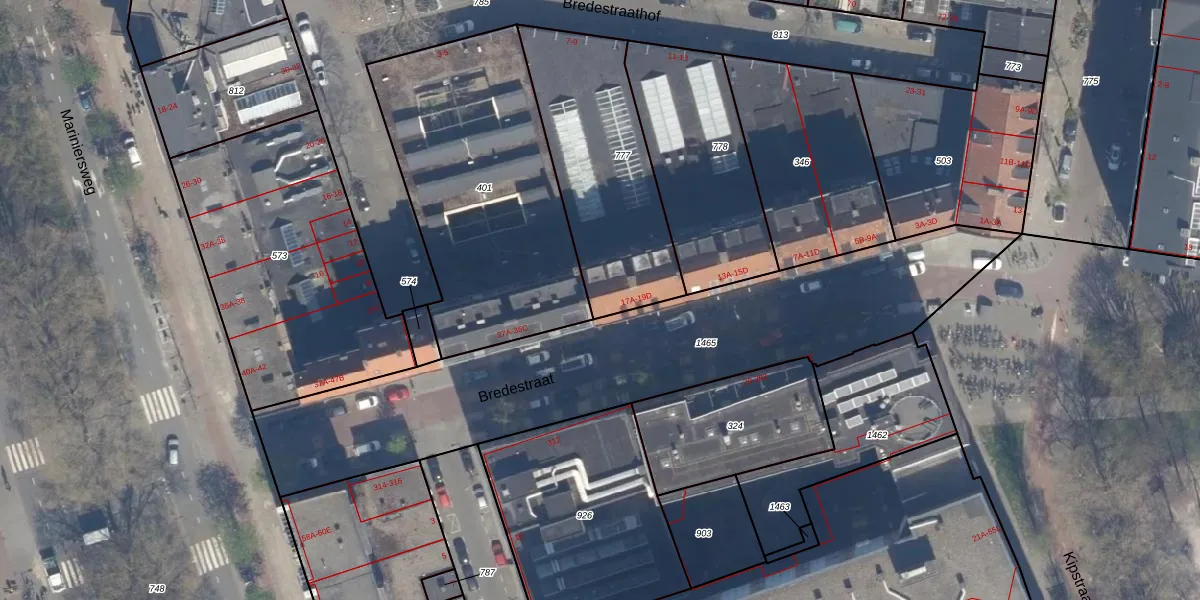 Het perceel waarop Bredestraat 19-B staat heeft een oppervlakte van 761 m². Dit is een groot perceel. De perceeloppervlakte wordt geregistreerd door het Kadaster. Gedetailleerde informatie over de maten van dit perceel kunt u vinden in het rapport Kadastrale kaart met maatvoering van Bredestraat 19-B.