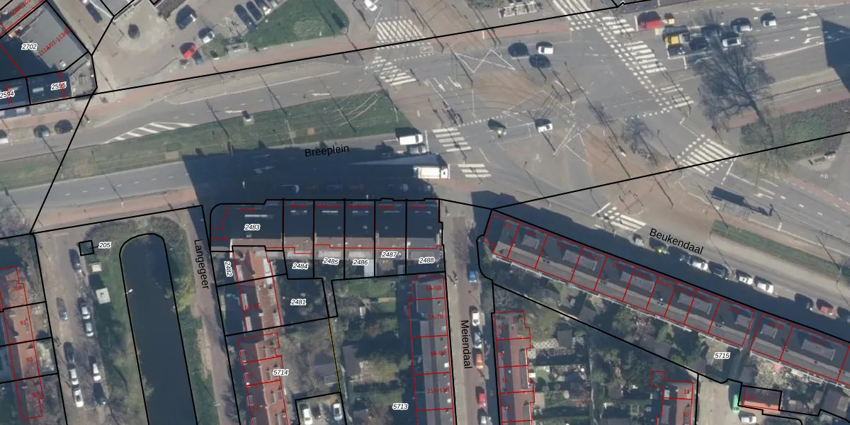 Breeplein 2-B is gelegen op kadastraal perceel RTD05V2488. Deze kadastrale aanduiding is uniek en wordt gebruikt door het Kadaster om eigendomsrechten en andere zakelijke rechten vast te leggen. Het perceel maakt onderdeel uit van de kadastrale gemeente Rotterdam.