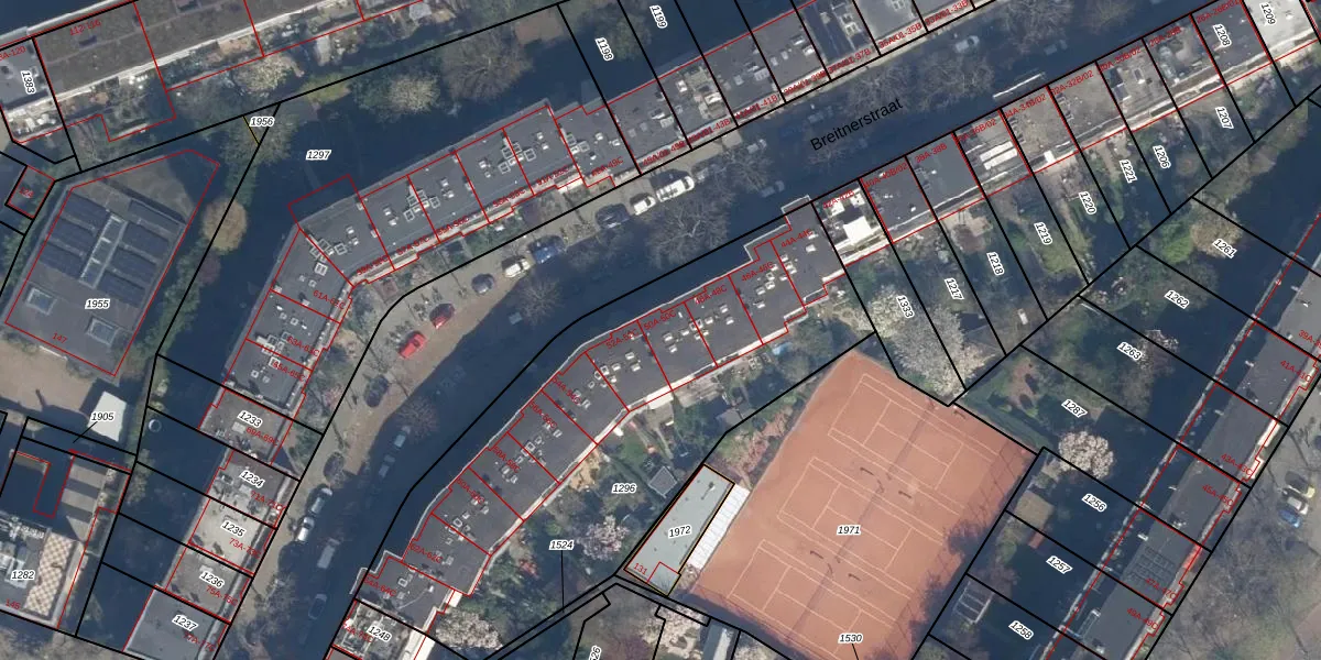 Het perceel waarop Breitnerstraat 50-A staat heeft een oppervlakte van 2286 m². Dit is een zeer groot perceel. De perceeloppervlakte wordt geregistreerd door het Kadaster. Gedetailleerde informatie over de maten van dit perceel kunt u vinden in het rapport Kadastrale kaart met maatvoering van Breitnerstraat 50-A.