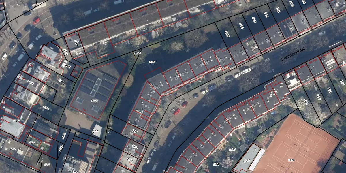 Het perceel waarop Breitnerstraat 57-B staat heeft een oppervlakte van 2284 m². Dit is een zeer groot perceel. De perceeloppervlakte wordt geregistreerd door het Kadaster. Gedetailleerde informatie over de maten van dit perceel kunt u vinden in het rapport Kadastrale kaart met maatvoering van Breitnerstraat 57-B.