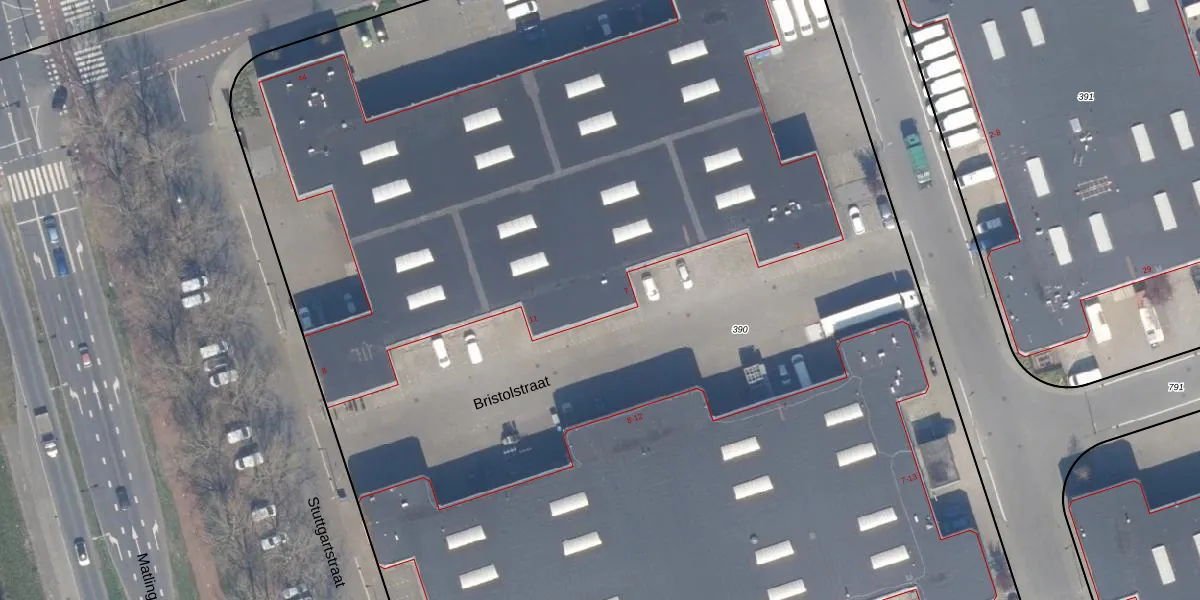 Het perceel waarop Bristolstraat 7 staat heeft een oppervlakte van 2,0 ha. Dit is een zeer groot perceel. De perceeloppervlakte wordt geregistreerd door het Kadaster. Gedetailleerde informatie over de maten van dit perceel kunt u vinden in het rapport Kadastrale kaart met maatvoering van Bristolstraat 7.