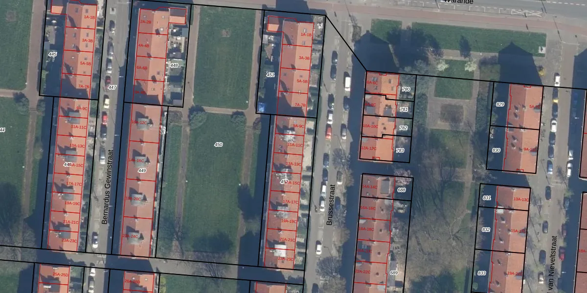Het perceel waarop Brussestraat 11-A staat heeft een oppervlakte van 836 m². Dit is een groot perceel. De perceeloppervlakte wordt geregistreerd door het Kadaster. Gedetailleerde informatie over de maten van dit perceel kunt u vinden in het rapport Kadastrale kaart met maatvoering van Brussestraat 11-A.