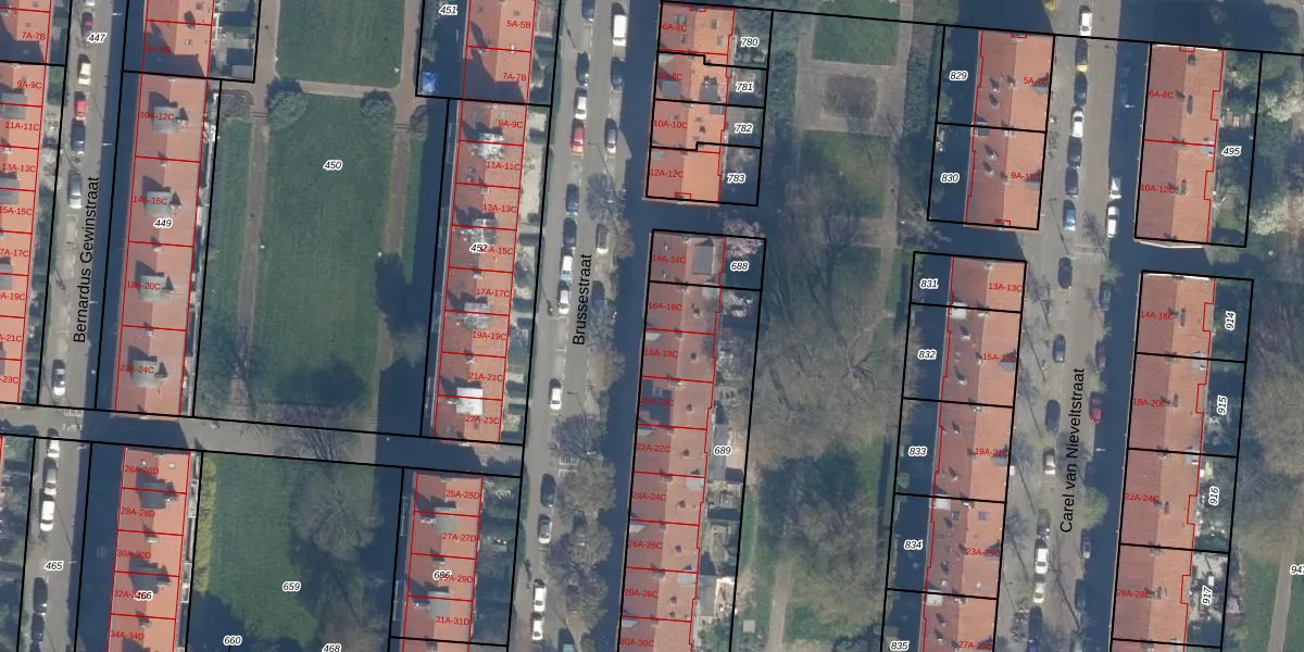 Het perceel waarop Brussestraat 16-C staat heeft een oppervlakte van 1075 m². Dit is een zeer groot perceel. De perceeloppervlakte wordt geregistreerd door het Kadaster. Gedetailleerde informatie over de maten van dit perceel kunt u vinden in het rapport Kadastrale kaart met maatvoering van Brussestraat 16-C.