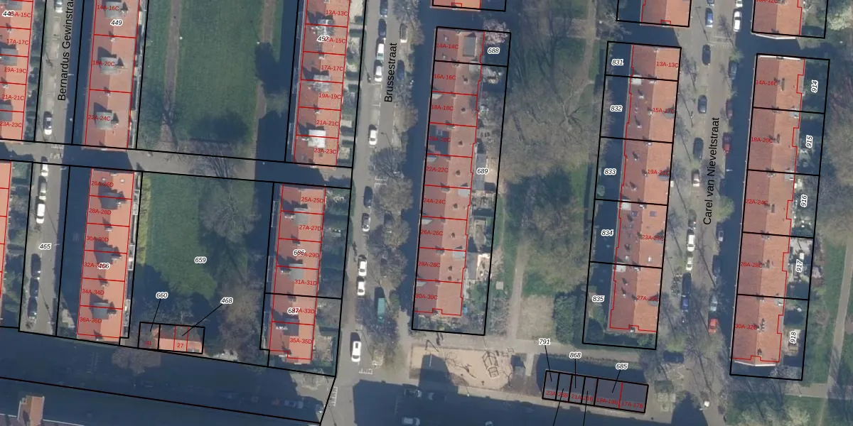 Het perceel waarop Brussestraat 24-A staat heeft een oppervlakte van 1075 m². Dit is een zeer groot perceel. De perceeloppervlakte wordt geregistreerd door het Kadaster. Gedetailleerde informatie over de maten van dit perceel kunt u vinden in het rapport Kadastrale kaart met maatvoering van Brussestraat 24-A.