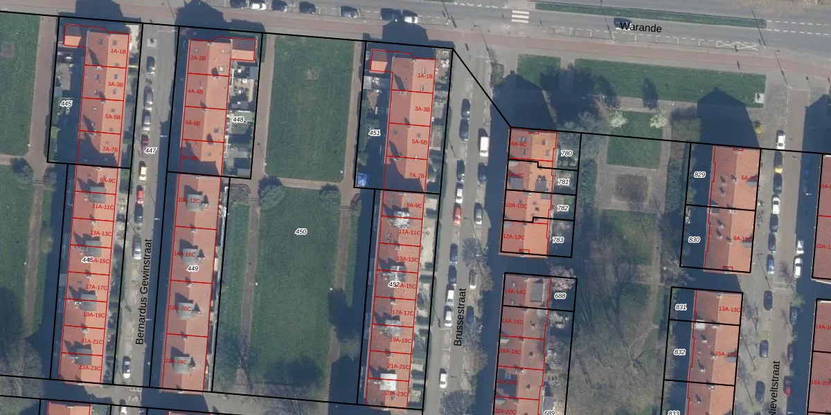 Het perceel waarop Brussestraat 9-C staat heeft een oppervlakte van 836 m². Dit is een groot perceel. De perceeloppervlakte wordt geregistreerd door het Kadaster. Gedetailleerde informatie over de maten van dit perceel kunt u vinden in het rapport Kadastrale kaart met maatvoering van Brussestraat 9-C.