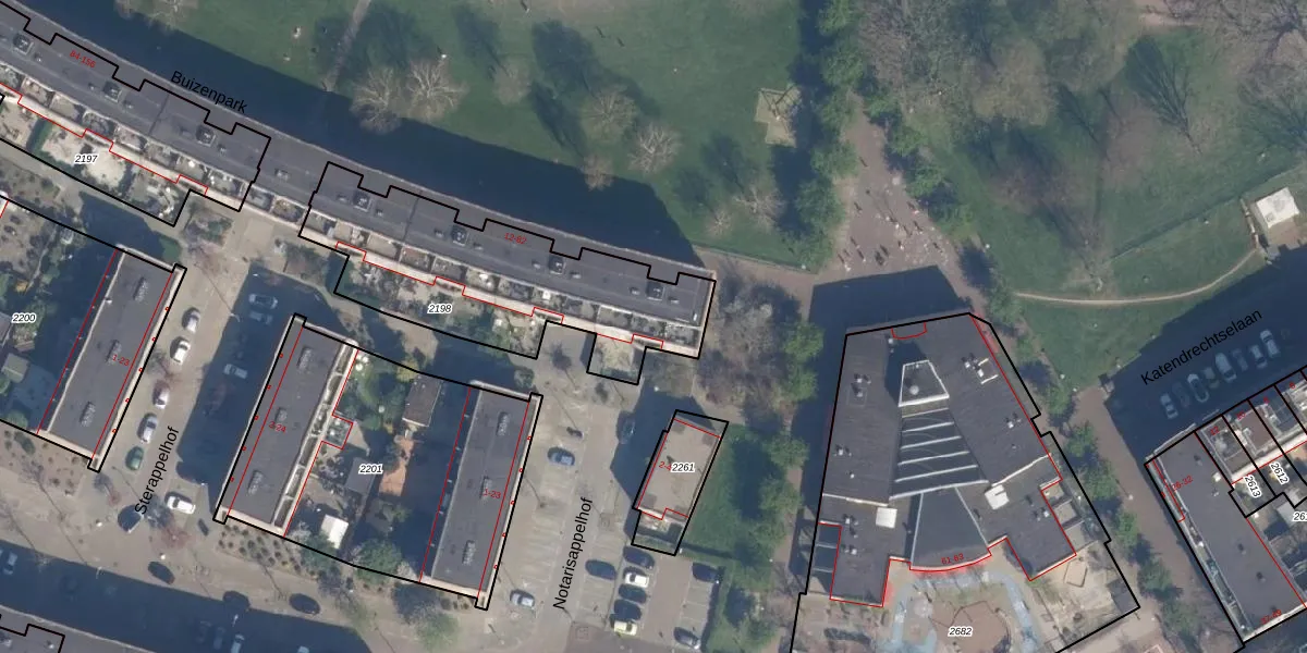 Het perceel waarop Buizenpark 14 staat heeft een oppervlakte van 977 m². Dit is een groot perceel. De perceeloppervlakte wordt geregistreerd door het Kadaster. Gedetailleerde informatie over de maten van dit perceel kunt u vinden in het rapport Kadastrale kaart met maatvoering van Buizenpark 14.