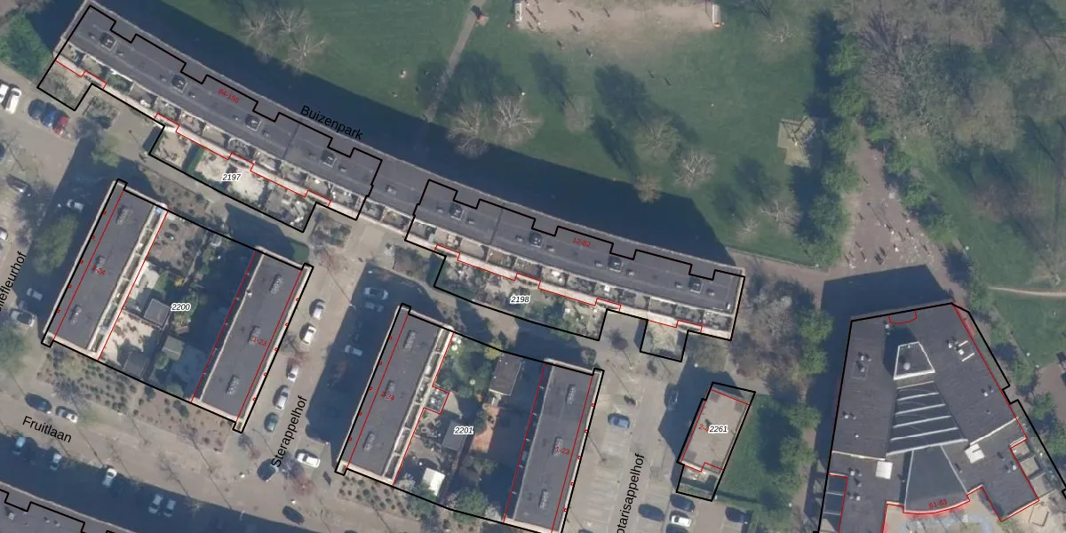 Het perceel waarop Buizenpark 54 staat heeft een oppervlakte van 977 m². Dit is een groot perceel. De perceeloppervlakte wordt geregistreerd door het Kadaster. Gedetailleerde informatie over de maten van dit perceel kunt u vinden in het rapport Kadastrale kaart met maatvoering van Buizenpark 54.