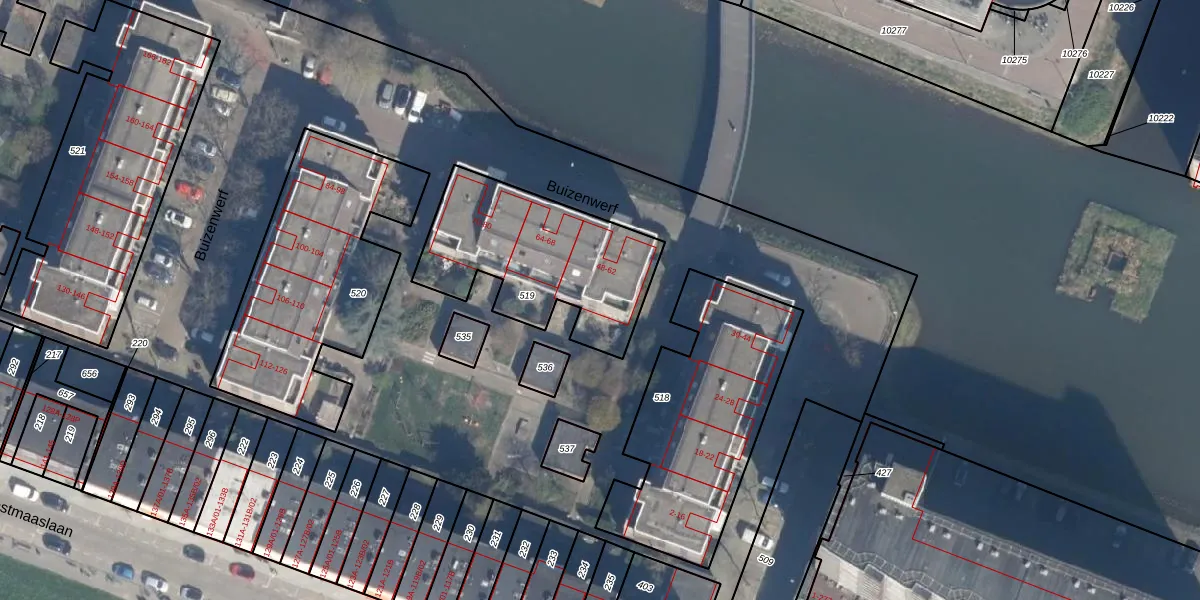 Buizenwerf 56 is gelegen op kadastraal perceel KLG00I519. Deze kadastrale aanduiding is uniek en wordt gebruikt door het Kadaster om eigendomsrechten en andere zakelijke rechten vast te leggen. Het perceel maakt onderdeel uit van de kadastrale gemeente Kralingen.