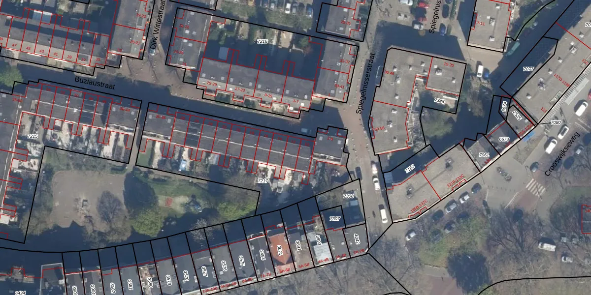 Het adres is gelegen op perceel 7217 in de sectie R en de kadastrale gemeente Rotterdam. De kadastrale aanduiding is aldus RTD07-R-7217. De gemiddelde perceeloppervlakte in de kadastrale gemeente Rotterdam is 506,86 m². Dit perceel is met zijn 1585 m² dus groter dan gemiddeld. De grootste perceeloppervlakte in de kadastrale gemeente is 10,8 ha. De kleinste oppervlakte bedraagt 0 m². Er zijn 18 adressen aanwezig op het perceel. De huidige grenzen van het perceel zijn digitaal in de Basisregistratie Kadaster (BRK) geregistreerd op 28-06-2004.