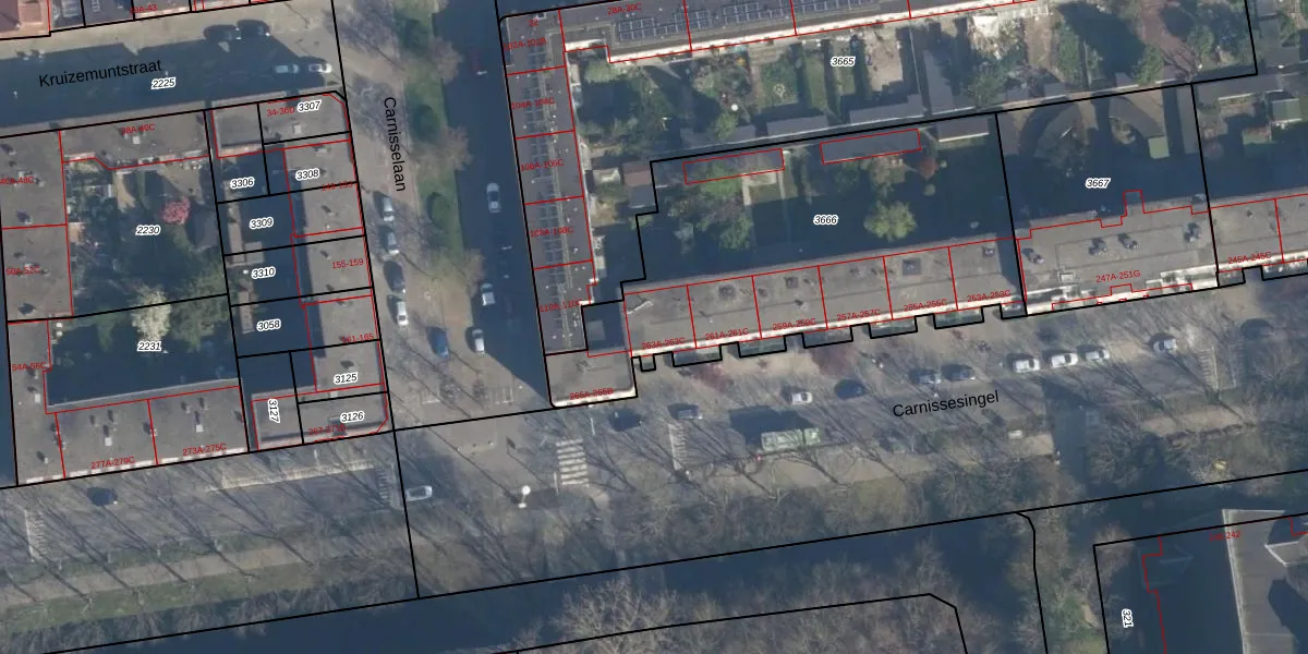 Carnissesingel 263-B is gelegen op kadastraal perceel CLS00H3666. Deze kadastrale aanduiding is uniek en wordt gebruikt door het Kadaster om eigendomsrechten en andere zakelijke rechten vast te leggen. Het perceel maakt onderdeel uit van de kadastrale gemeente Charlois.