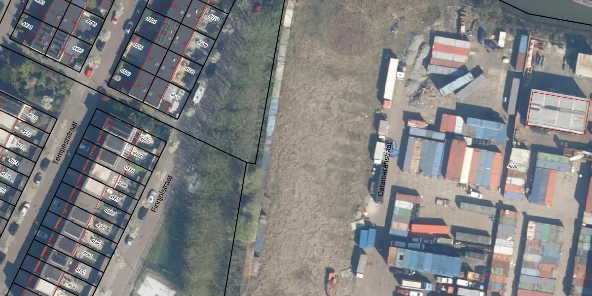 Het perceel waarop Catamaranstraat 149 staat heeft een oppervlakte van 1,8 ha. Dit is een zeer groot perceel. De perceeloppervlakte wordt geregistreerd door het Kadaster. Gedetailleerde informatie over de maten van dit perceel kunt u vinden in het rapport Kadastrale kaart met maatvoering van Catamaranstraat 149.