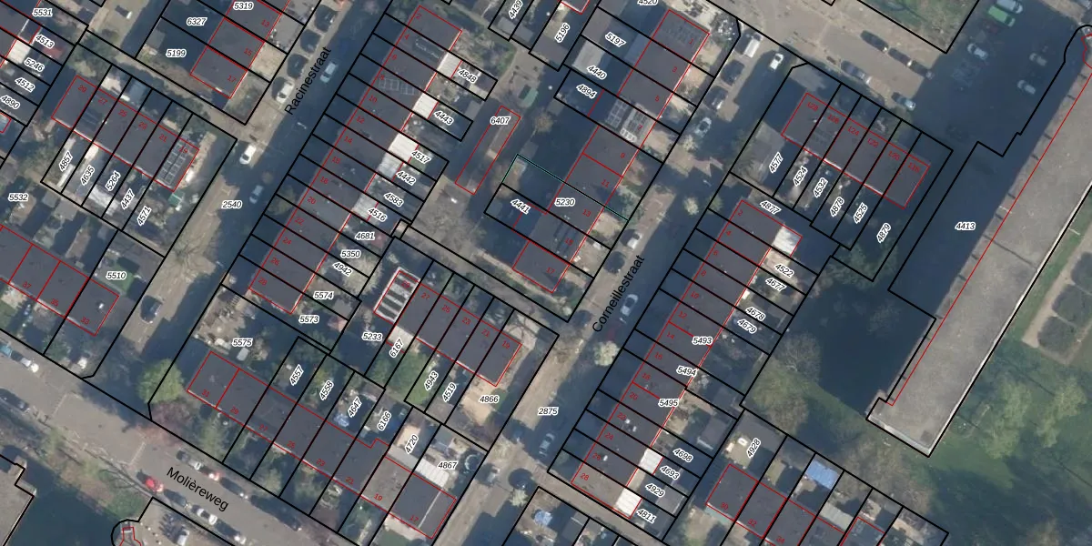 Het perceel waarop Corneillestraat 17 staat heeft een oppervlakte van 1526 m². Dit is een zeer groot perceel. De perceeloppervlakte wordt geregistreerd door het Kadaster. Gedetailleerde informatie over de maten van dit perceel kunt u vinden in het rapport Kadastrale kaart met maatvoering van Corneillestraat 17.