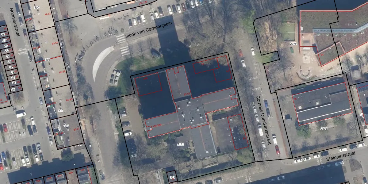 Het perceel waarop Cornelis Danckertsstraat 39 staat heeft een oppervlakte van 3908 m². Dit is een zeer groot perceel. De perceeloppervlakte wordt geregistreerd door het Kadaster. Gedetailleerde informatie over de maten van dit perceel kunt u vinden in het rapport Kadastrale kaart met maatvoering van Cornelis Danckertsstraat 39.