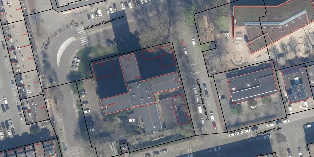 Het perceel waarop Cornelis Danckertsstraat 45 staat heeft een oppervlakte van 3908 m². Dit is een zeer groot perceel. De perceeloppervlakte wordt geregistreerd door het Kadaster. Gedetailleerde informatie over de maten van dit perceel kunt u vinden in het rapport Kadastrale kaart met maatvoering van Cornelis Danckertsstraat 45.