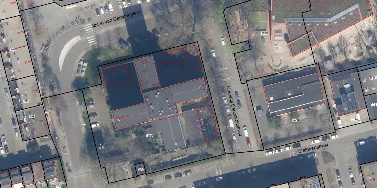 Het perceel waarop Cornelis Danckertsstraat 59 staat heeft een oppervlakte van 3908 m². Dit is een zeer groot perceel. De perceeloppervlakte wordt geregistreerd door het Kadaster. Gedetailleerde informatie over de maten van dit perceel kunt u vinden in het rapport Kadastrale kaart met maatvoering van Cornelis Danckertsstraat 59.