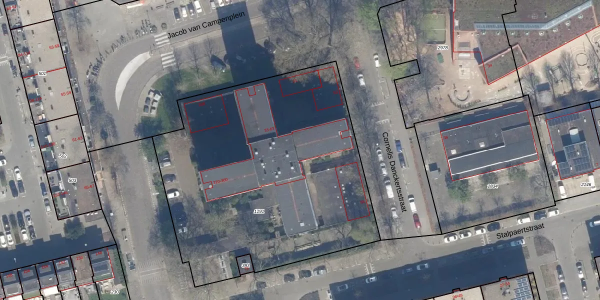 Het perceel waarop Cornelis Danckertsstraat 61 staat heeft een oppervlakte van 3908 m². Dit is een zeer groot perceel. De perceeloppervlakte wordt geregistreerd door het Kadaster. Gedetailleerde informatie over de maten van dit perceel kunt u vinden in het rapport Kadastrale kaart met maatvoering van Cornelis Danckertsstraat 61.