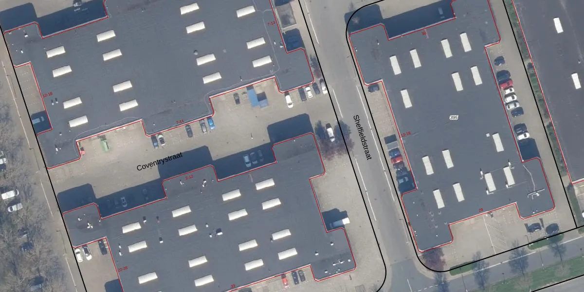Het perceel waarop Coventrystraat 2 staat heeft een oppervlakte van 2,0 ha. Dit is een zeer groot perceel. De perceeloppervlakte wordt geregistreerd door het Kadaster. Gedetailleerde informatie over de maten van dit perceel kunt u vinden in het rapport Kadastrale kaart met maatvoering van Coventrystraat 2.