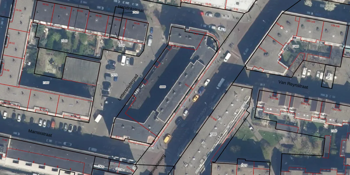 Het adres ligt op het perceel RTD07-R-6888, dat zich in de kadastrale gemeente Rotterdam bevindt. Het perceel is met 1833 m² relatief groot. Het gemiddelde ligt in de kadastrale gemeente Rotterdam op 506,86 m². De grootste perceeloppervlakte in de kadastrale gemeente is 10,8 ha. De kleinste oppervlakte bedraagt 0 m². Op het perceel zijn 40 adressen aanwezig. De huidige grenzen van het perceel zijn digitaal in de Basisregistratie Kadaster (BRK) geregistreerd op 24-01-2003.
