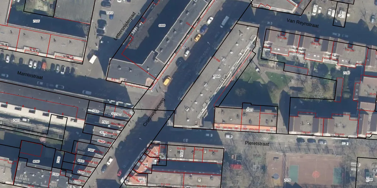 Het adres ligt op het perceel RTD07-R-7084, dat zich in de kadastrale gemeente Rotterdam bevindt. Het perceel is met 1110 m² relatief groot. Het gemiddelde ligt in de kadastrale gemeente Rotterdam op 506,86 m². De grootste perceeloppervlakte in de kadastrale gemeente is 10,8 ha. De kleinste oppervlakte bedraagt 0 m². Op het perceel liggen in totaal 31 adressen. De huidige grenzen van het perceel zijn digitaal in de Basisregistratie Kadaster (BRK) geregistreerd op 24-01-2003.