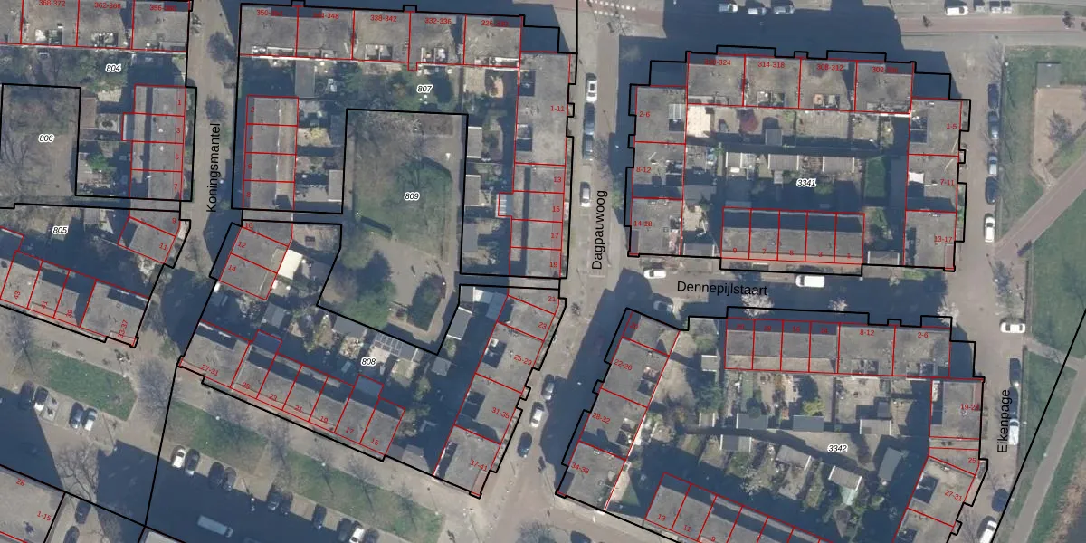 Het perceel waarop Dagpauwoog 19 staat heeft een oppervlakte van 2078 m². Dit is een zeer groot perceel. De perceeloppervlakte wordt geregistreerd door het Kadaster. Gedetailleerde informatie over de maten van dit perceel kunt u vinden in het rapport Kadastrale kaart met maatvoering van Dagpauwoog 19.