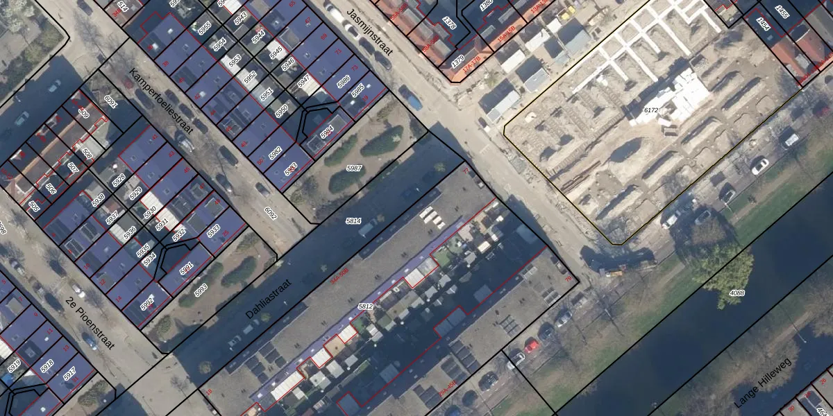 Het perceel waarop Dahliastraat 36-A staat heeft een oppervlakte van 3415 m². Dit is een zeer groot perceel. De perceeloppervlakte wordt geregistreerd door het Kadaster. Gedetailleerde informatie over de maten van dit perceel kunt u vinden in het rapport Kadastrale kaart met maatvoering van Dahliastraat 36-A.