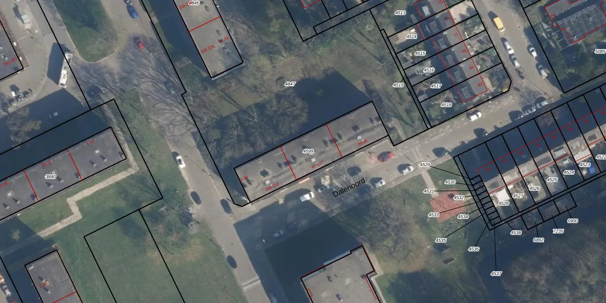 Het perceel waarop Dalenoord 107 staat heeft een oppervlakte van 637 m². Dit is een groot perceel. De perceeloppervlakte wordt geregistreerd door het Kadaster. Gedetailleerde informatie over de maten van dit perceel kunt u vinden in het rapport Kadastrale kaart met maatvoering van Dalenoord 107.