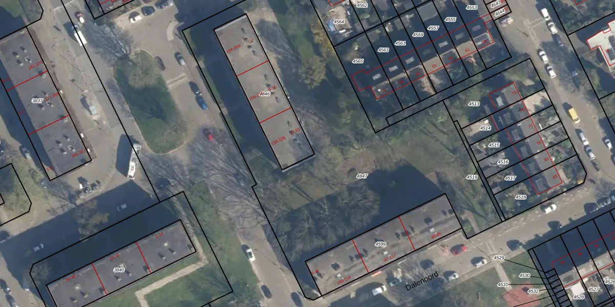 Het perceel waarop Dalenoord 23 staat heeft een oppervlakte van 587 m². Dit is een groot perceel. De perceeloppervlakte wordt geregistreerd door het Kadaster. Gedetailleerde informatie over de maten van dit perceel kunt u vinden in het rapport Kadastrale kaart met maatvoering van Dalenoord 23.