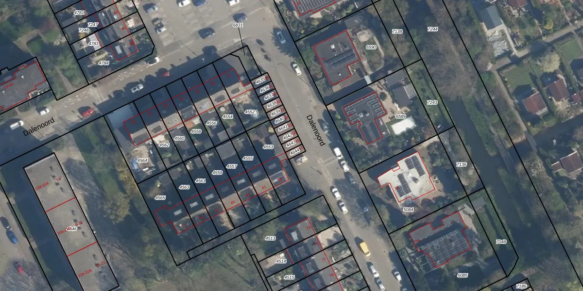 Het perceel waarop Dalenoord 55 staat heeft een oppervlakte van 19 m². Dit is een klein perceel. De perceeloppervlakte wordt geregistreerd door het Kadaster. Gedetailleerde informatie over de maten van dit perceel kunt u vinden in het rapport Kadastrale kaart met maatvoering van Dalenoord 55.