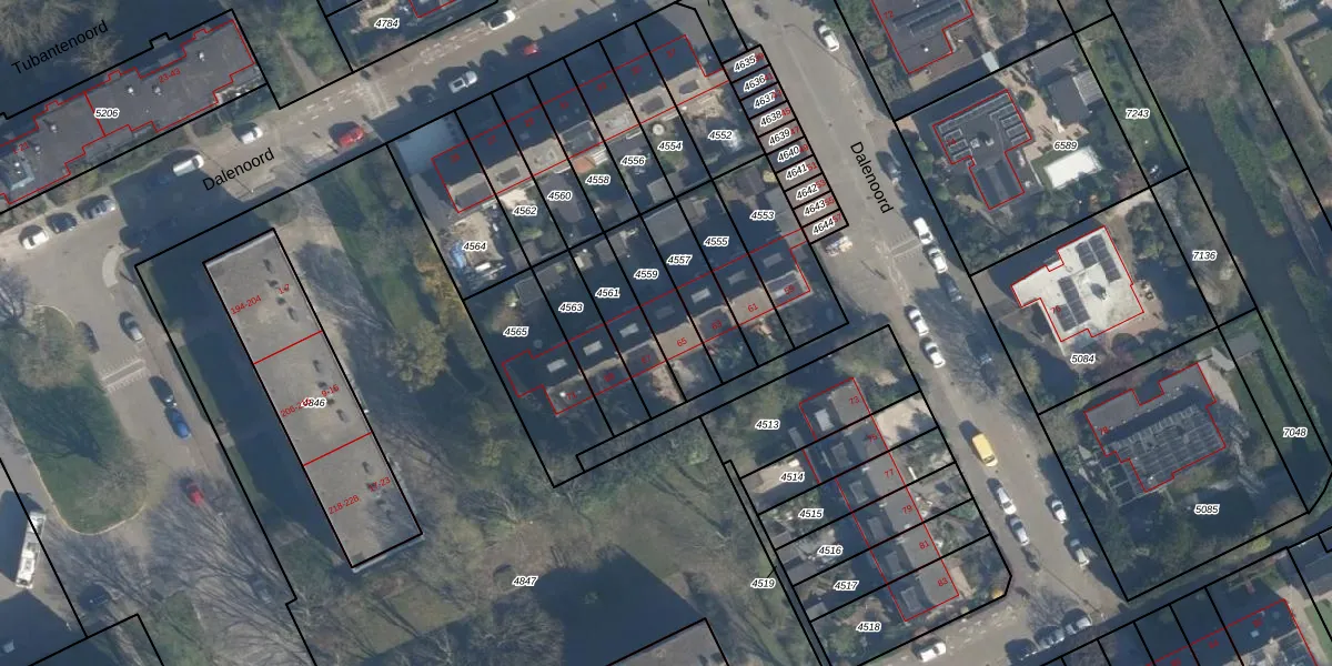 Het perceel waarop Dalenoord 65 staat heeft een oppervlakte van 170 m². Dit is een middelgroot perceel. De perceeloppervlakte wordt geregistreerd door het Kadaster. Gedetailleerde informatie over de maten van dit perceel kunt u vinden in het rapport Kadastrale kaart met maatvoering van Dalenoord 65.