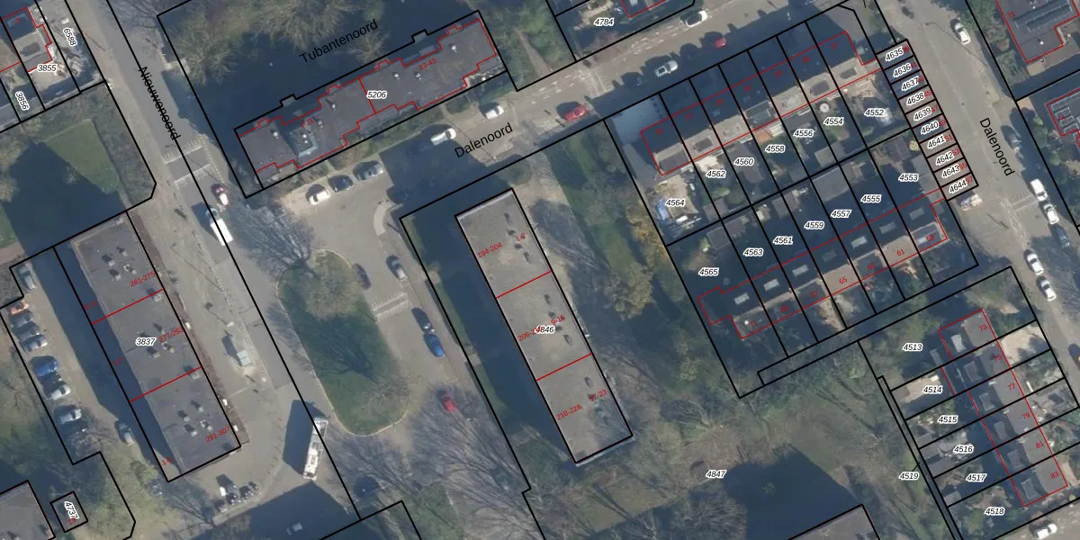 Het perceel waarop Dalenoord 7 staat heeft een oppervlakte van 587 m². Dit is een groot perceel. De perceeloppervlakte wordt geregistreerd door het Kadaster. Gedetailleerde informatie over de maten van dit perceel kunt u vinden in het rapport Kadastrale kaart met maatvoering van Dalenoord 7.