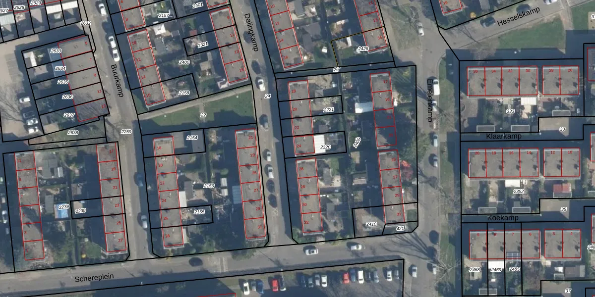 Dalingkamp 24 is gelegen op kadastraal perceel CLS00K2320. Deze kadastrale aanduiding is uniek en wordt gebruikt door het Kadaster om eigendomsrechten en andere zakelijke rechten vast te leggen. Het perceel maakt onderdeel uit van de kadastrale gemeente Charlois.