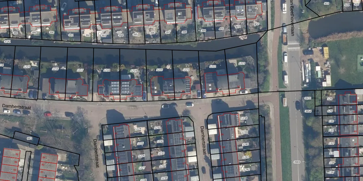Het perceel waarop Damhertstraat 28 staat heeft een oppervlakte van 400 m². Dit is een groot perceel. De perceeloppervlakte wordt geregistreerd door het Kadaster. Gedetailleerde informatie over de maten van dit perceel kunt u vinden in het rapport Kadastrale kaart met maatvoering van Damhertstraat 28.