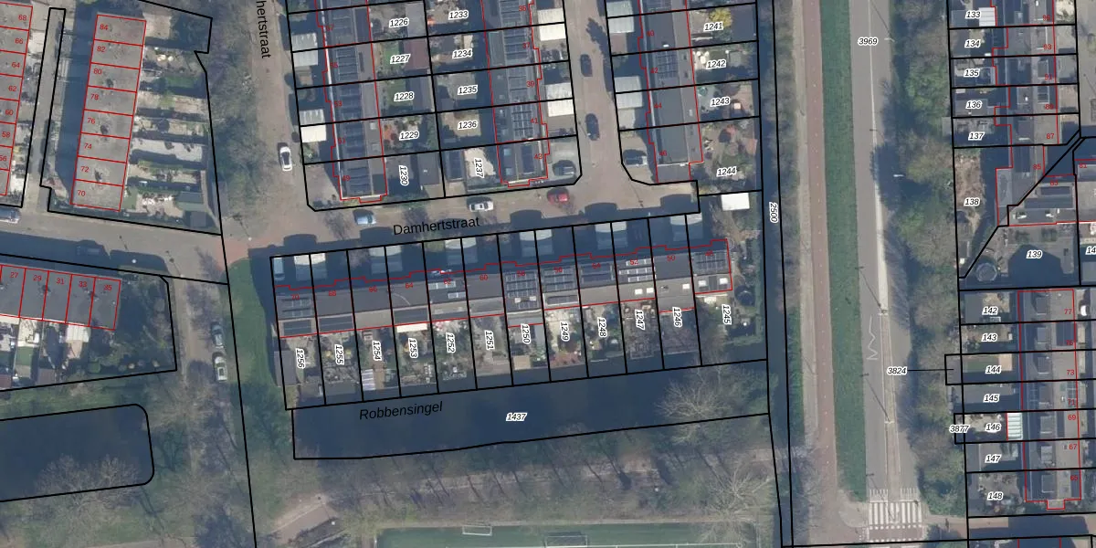 Het perceel waarop Damhertstraat 56 staat heeft een oppervlakte van 192 m². Dit is een middelgroot perceel. De perceeloppervlakte wordt geregistreerd door het Kadaster. Gedetailleerde informatie over de maten van dit perceel kunt u vinden in het rapport Kadastrale kaart met maatvoering van Damhertstraat 56.