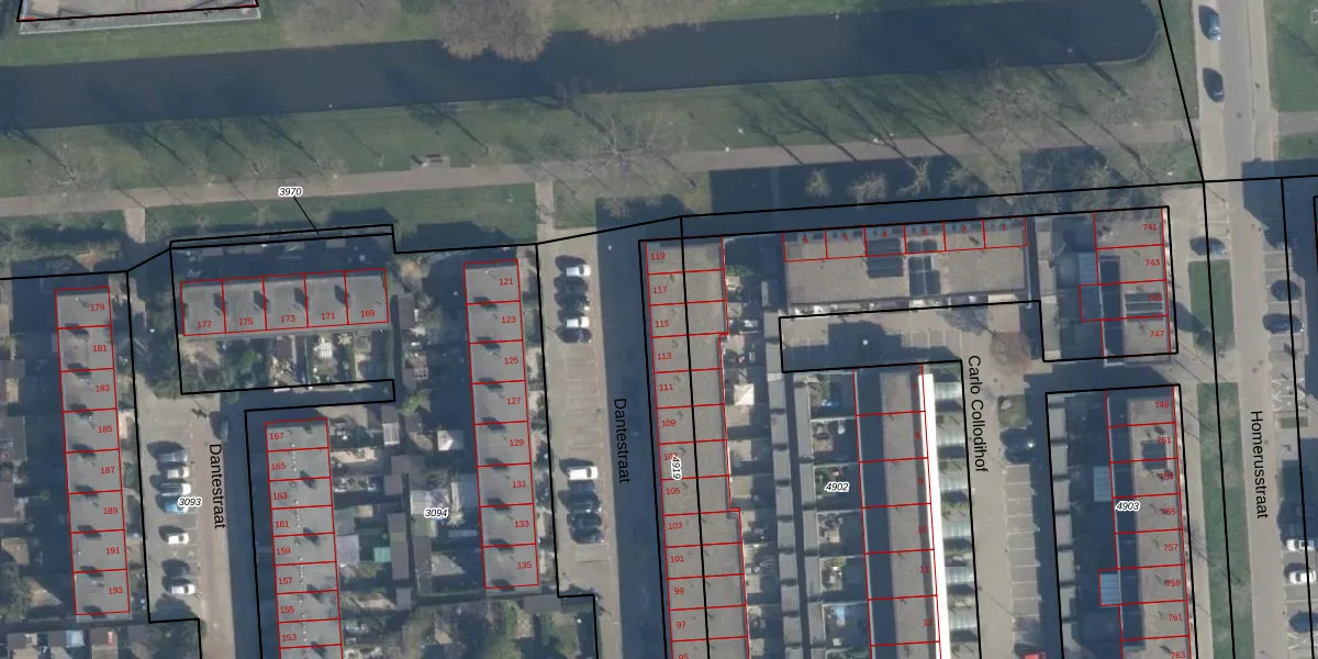 Dantestraat 115 is gelegen op kadastraal perceel ISM01C4919. Deze kadastrale aanduiding is uniek en wordt gebruikt door het Kadaster om eigendomsrechten en andere zakelijke rechten vast te leggen. Het perceel maakt onderdeel uit van de kadastrale gemeente IJsselmonde.